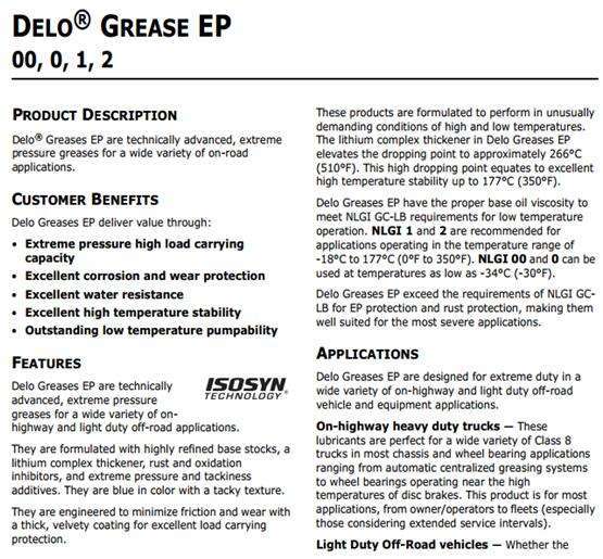 NLGI 1和2是马克GC-LB NLGI认证批准。雪佛龙Delo油脂EP满足麦克MG-C油脂的要求规范。