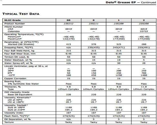 制定本产品执行异常苛刻条件下的高和低的温度。DELO GREASE EP油脂的锂复合增稠剂EP提升了滴点约266°C(510°F)。这么高滴点相当于优异的高温稳定性高177°C(350°F)。雪佛龙Delo油脂EP的基础油粘度,以满足NLGI GC-LB要求低温操作。NLGI 1和2推荐应用程序操作的温度范围-18°C到177°C(0°F到350°F)。NLGI 00和0可以使用在温度低至-34°C(-30°F)。